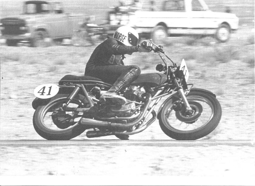 By the end of the front straight, it became apparent I had guessed horribly wrong on the jetting. Too lean, shooting ducks. Now I was pissed. With my head down, the bit between my teeth, I began to rip through the sixty-two riders in front of me. They went by in gaggles, sometimes three and four in a single turn. Slowing my progress was my lack of speed on the front straight, giving back five to seven places. On lap two, coming onto the back straight, I was closing on Cary Andrews, on his CR750 replica. I could do no wrong, and decided I would pass him and the two he was dicing with, in spite of being some twenty to thirty bike lengths behind. When they shut off and set up for the kink going into the horseshoe turn, I didn't. Blew by them, on the gas! Braking hard in a straight line, got whoa'd down in time to pitch it sideways in the marbles, flat-tracked around the outside of the turn, while they passed me back, got the big drive out of the turn, re-passing all three on exit. It was after that pass, that Cary asked me to ride for him. A lap later, I was in second, having made over seventy passes for position in 2½ laps, running down the Spec 2 RD.